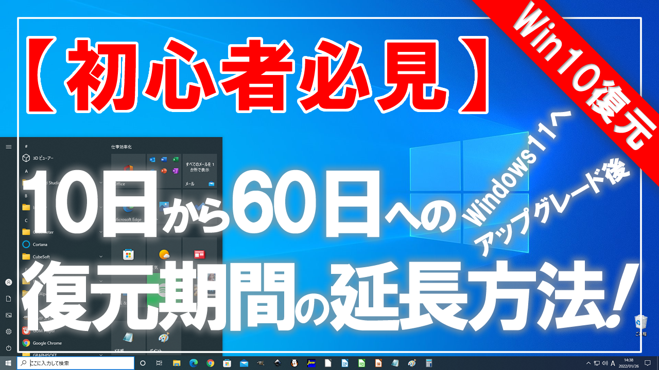 この動画を観ると、Windows 11 へのアップグレード後に、 Windows 10 への10日間の復元期間を60日間へ延長する方法が学べます。