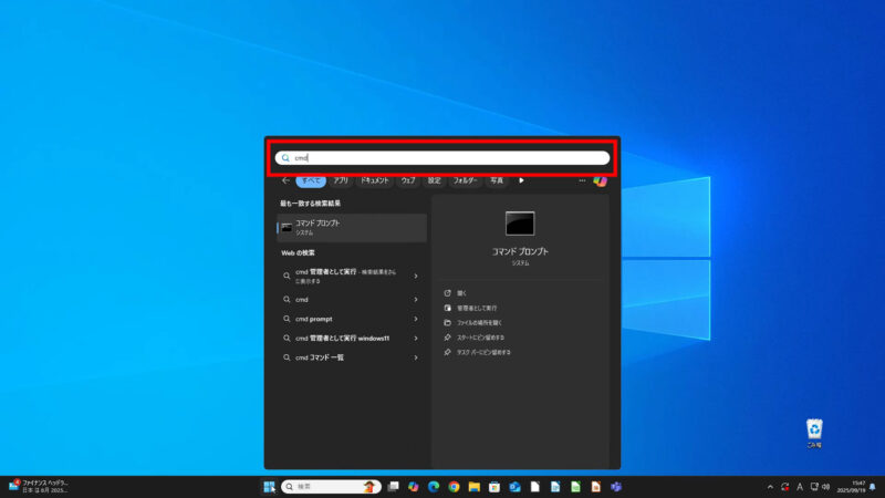 メニューが表示されるので、検索窓に「cmd」と入力すると、